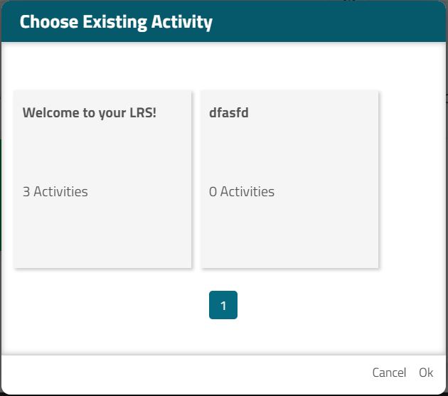 You can create Activities from the Activities page. The activities page lists all the activities in this LRS, and allows you too search for or edit them, or create new ones.