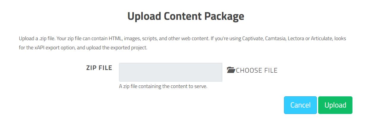 value is this value, Veracity Learning LRS understands that the statement is about this Activity. If you leave this value blank, we'll assume it is the same as the Launch URL. Due to the xAPI specification, this must by a fully formed URI.If you have content, but have nowhere to host it, then you might want Veracity Learning LRS to serve the content for you. You can upload a .zip archive file, and we will serve the file contents. Data uploaded as a ZIP file counts against the data storage allocation for the LRS.