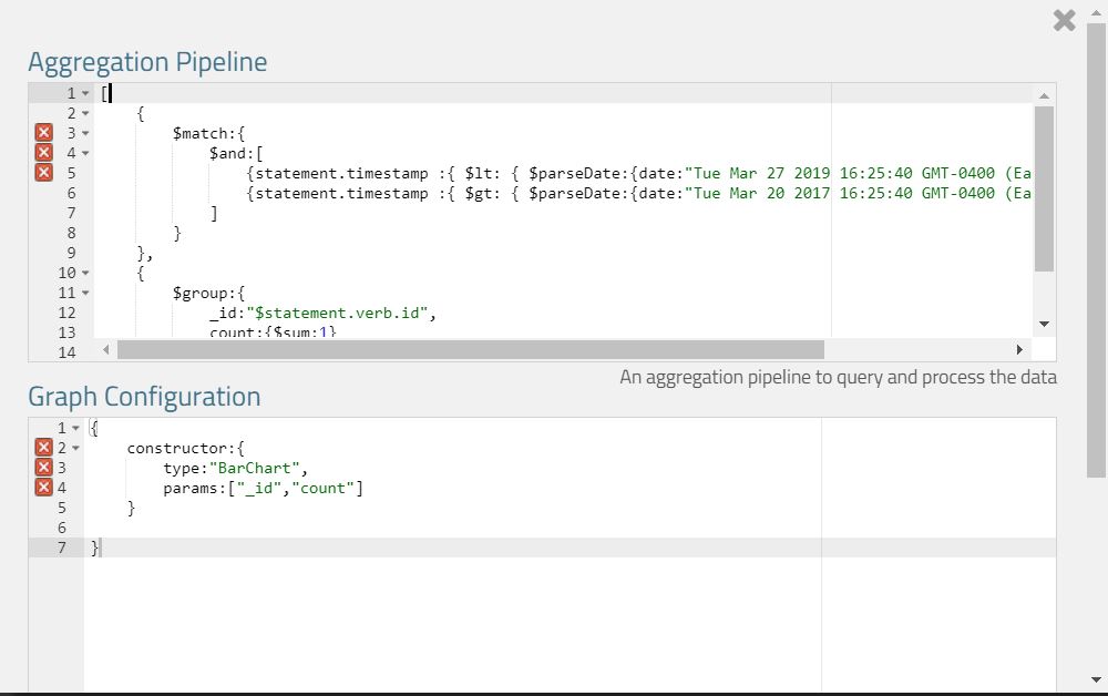 The second box is JSON to configure the graphic display. Veracity Learning LRS includes some common configurations that you can call on by including a "constructor" field.