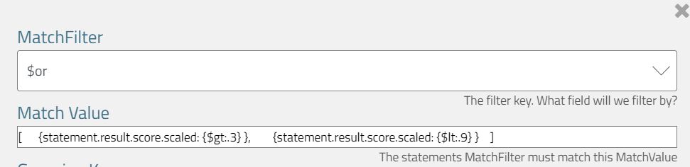 Clicking the dropdown in "MatchFilter" will give you a list of fields from the xAPI statement specification.