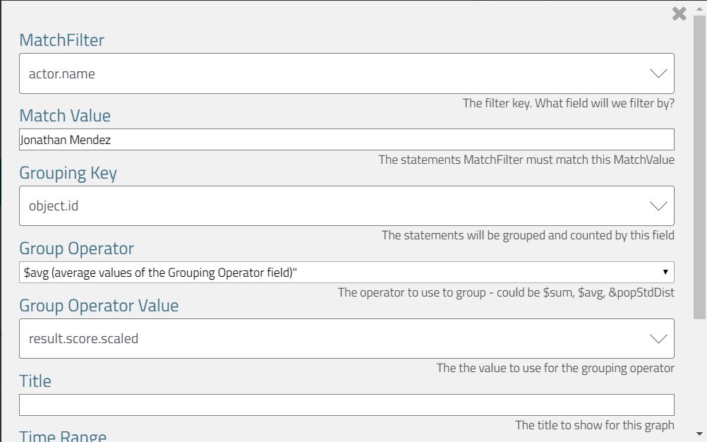 The setup below would create a bar chart showing the average score of all statements on each object where the actor name is "Jonathan Mendez". Each bar will represent one object.id, and the height of the bar will be the average score for that actor on that object.