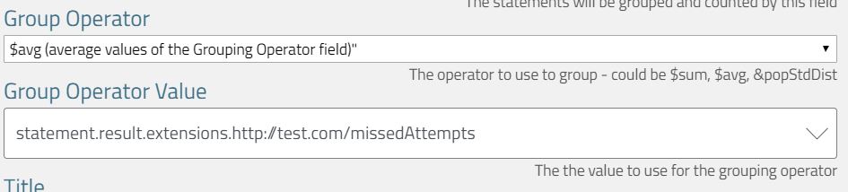 The group operator value tells Veracity Learning LRS where to get the values. Choosing a grouping operator of "sum" and a grouping operator value of "1" means "Count the statements that went into each group."