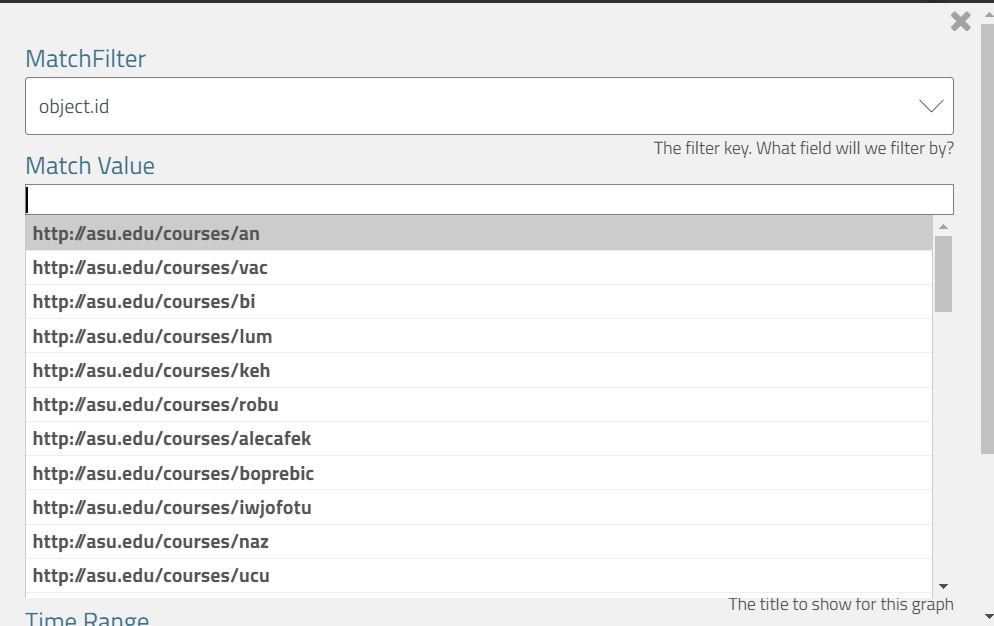 In this case, we've selected the Object.id value. Clicking in Match Value will list the top hits for this value. In this case, the courses listed are the most requested object ids used in xAPI statements. You can also type words into the box to search.