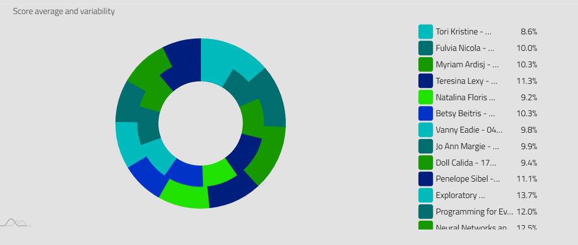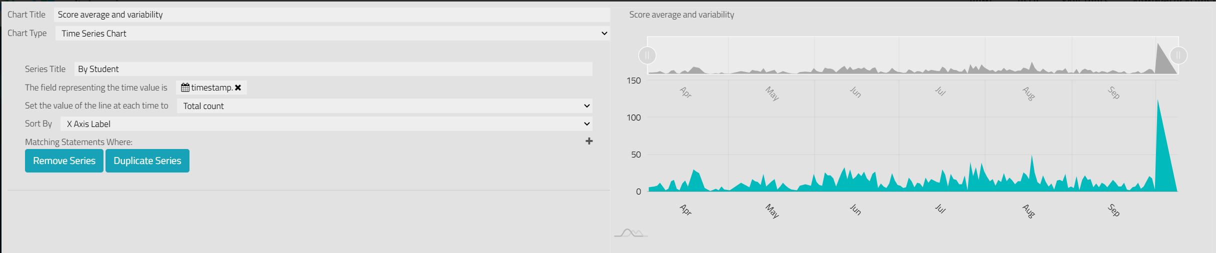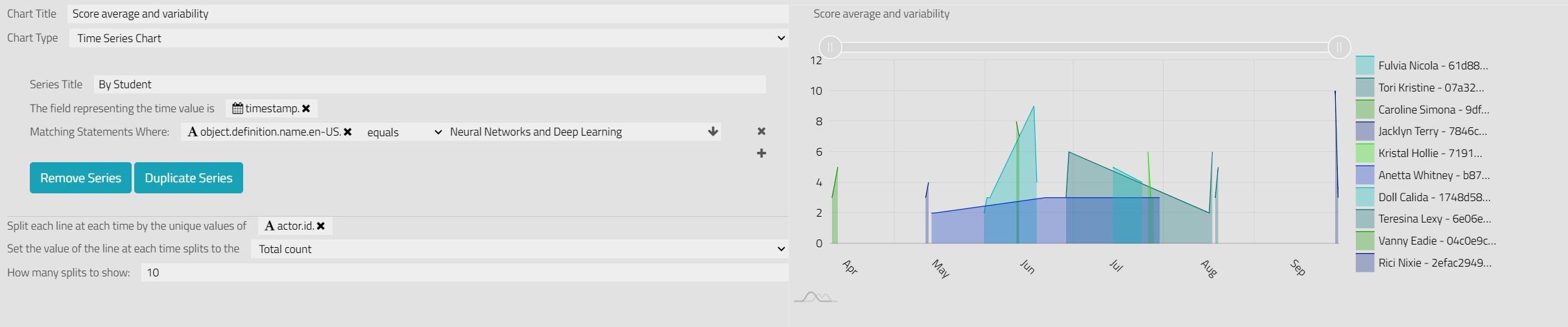Veracity Learning LRS exposes a highly customizable set of widgets that can build a huge variety of charts. These are the Generic Pie, Generic Bar and Generic Serial charts. Each exposes a query builder that will help you build complex queries.