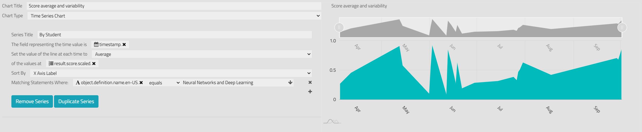 These three widgets all work on the same principle. Filter all the xAPI statements into a smaller set, then group them into buckets by some criteria. For each bucket, we can compute the min, max, average or standard deviation for different parts of the statement.